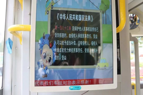 白銀區(qū)司法局聯(lián)合白銀公交公司,打造“民法典法治宣傳專列”。城區(qū)10條客流量較大的公交線路上,公交車廂變身為移動的法治課堂?!案呖諕佄镓熑巍薄盎橐黾彝?quán)益”等熱點法條海報隨處可見,車載屏幕循環(huán)播放普法情景短劇。市民乘坐公交時,不經(jīng)意間就與民法典“撞個滿懷”。