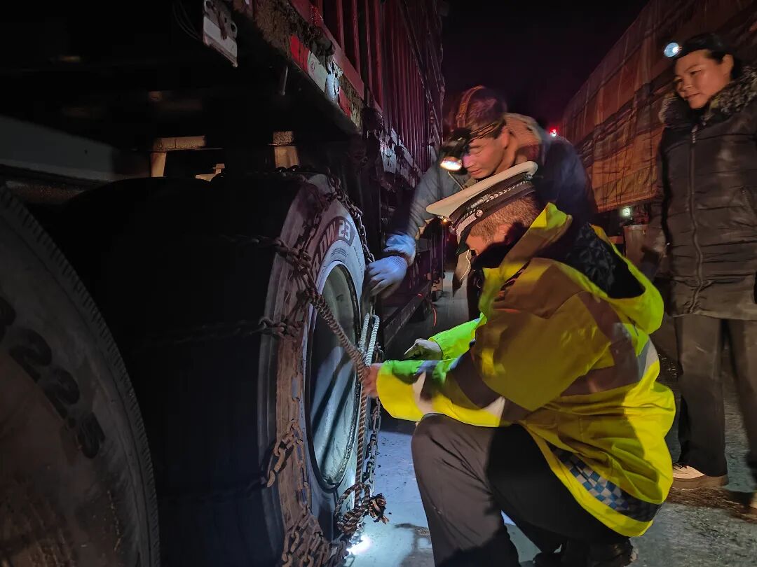 定西公安交警用“事事上心”的責(zé)任感幫助大型車輛安裝防滑鏈。